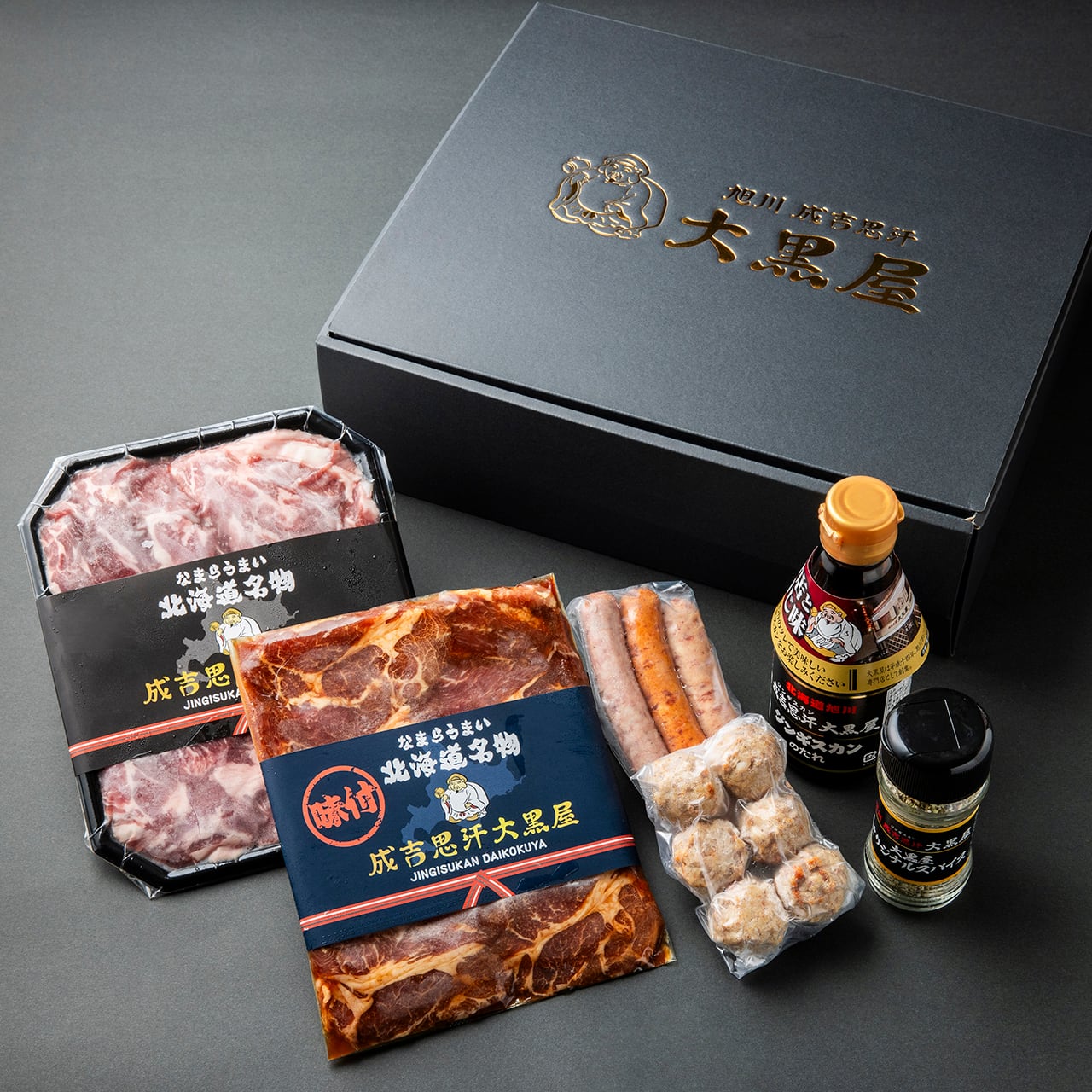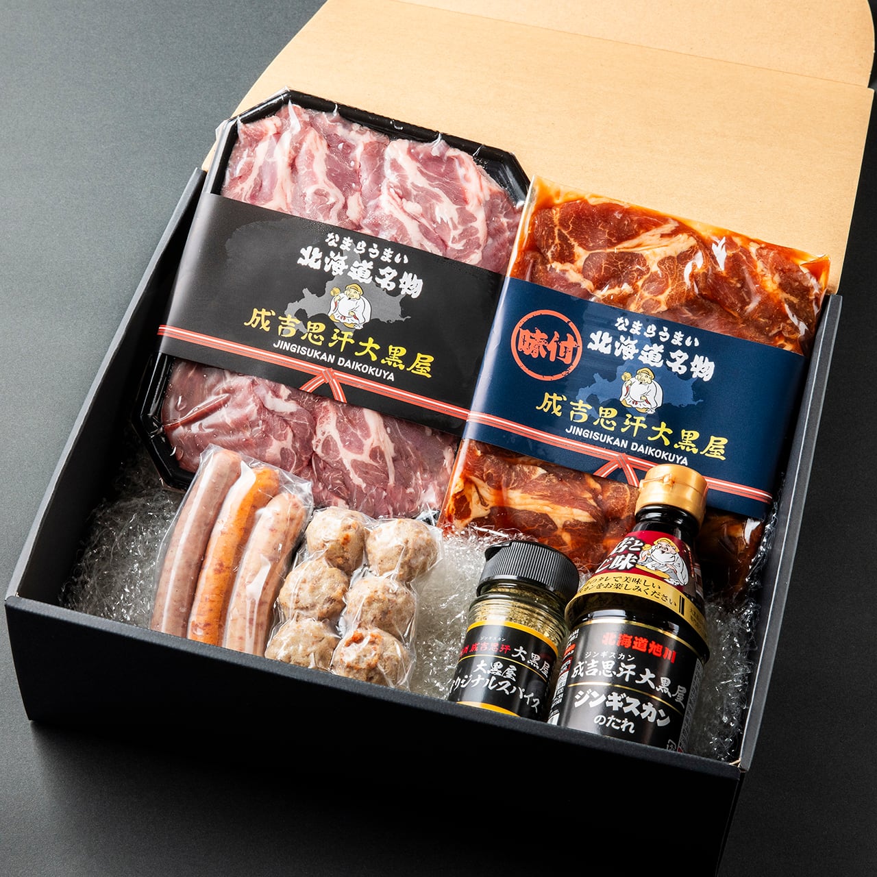 肩ロース190g×1パック/肩ロース(味付)190g×1パック/ソーセージ3本/つくね6個/ジンギスカンのタレ1本/大黒スパイス1本