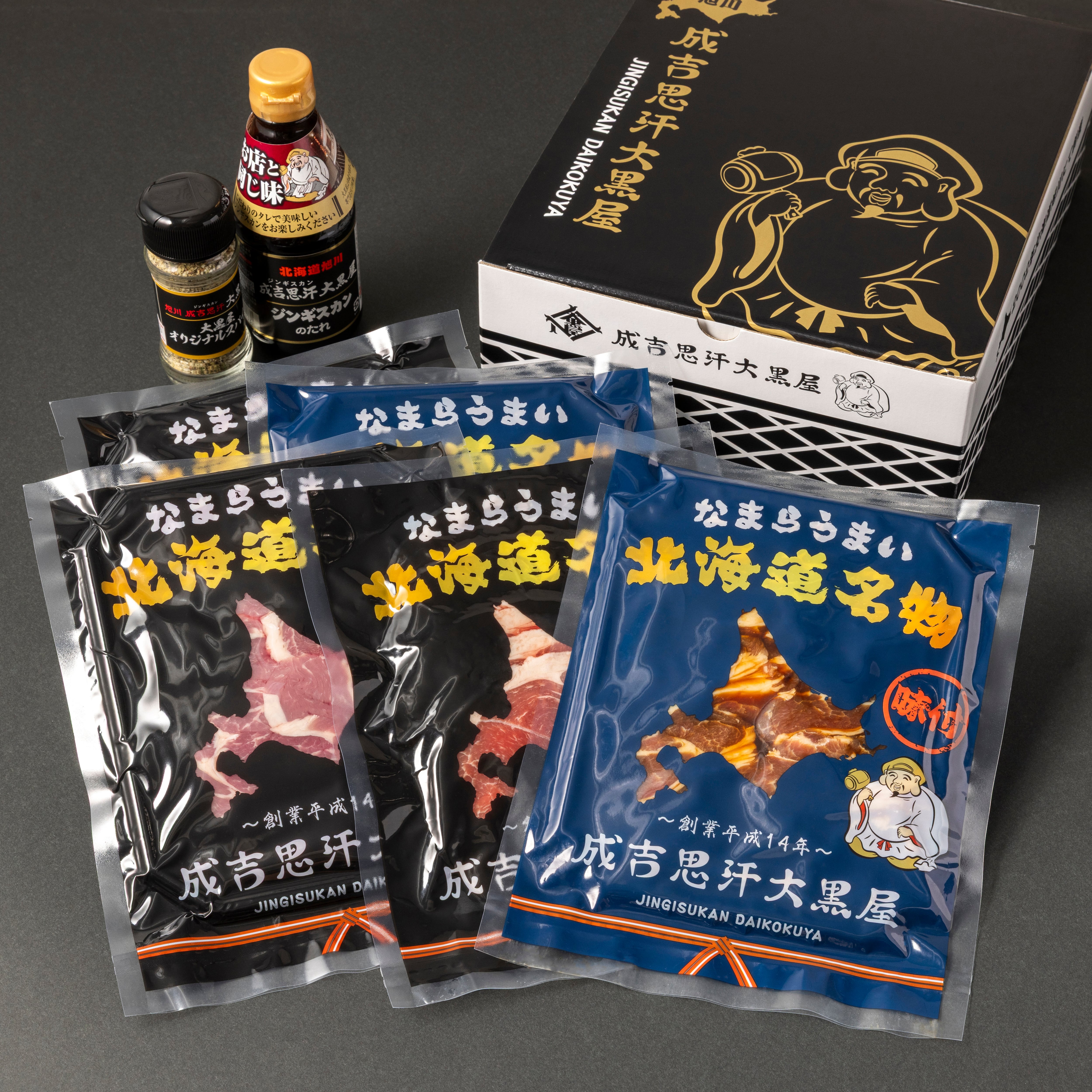 肩ロース150g×2パック/味付ジンギスカン250g×2パック/ラムロール250g×1パック/ジンギスカンのタレ1本/大黒スパイス1本